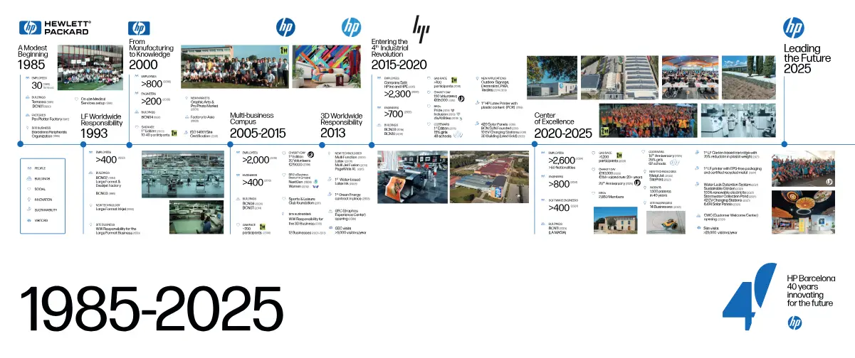 Este año 2025 será muy recordado por toda la plantilla de HP en España, principalmente la que opera en el hub de Sant Cugat del Vallès. Y es que este centro cumple 40 años de presencia en este territorio, habiendo sido testigo de las revoluciones más importantes que se han dado en la historia de la tecnología. No solo eso, sino que también ha sido parte activa importante en esta trayectoria. Lo que empezó en 1985 con un puñado de ingenieros dedicados a fabricar plóteres gráficos es hoy el mayor hub de I+D de la compañía fuera de Estados Unidos: un ecosistema con más de 2.600 profesionales de 60 nacionalidades que impulsa desde esta localización la evolución global de la impresión y la fabricación digital. Bajo la perspectiva que ofrecen estas cuatro décadas, se puede afirmar que por HP Barcelona han pasado las innovaciones más importantes de las artes gráficas: desde las primeras impresoras de gran formato hasta las soluciones de impresión 3D y los sistemas de automatización más avanzados. Más allá de la propia innovación, esta factoría de HP ha conseguido convertir la tecnología en un puente entre creatividad y sostenibilidad, entre empresa y sociedad.