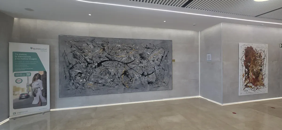 Las obras de que se exhiben en el hospital pertenecen a su serie “Energy 24”, una colección de piezas abstractas de gran formato en las que el color se convierte en protagonista absoluto. Rojos intensos, azules eléctricos, verdes vibrantes y amarillos luminosos se entrelazan en composiciones que, más que verse, se sienten.